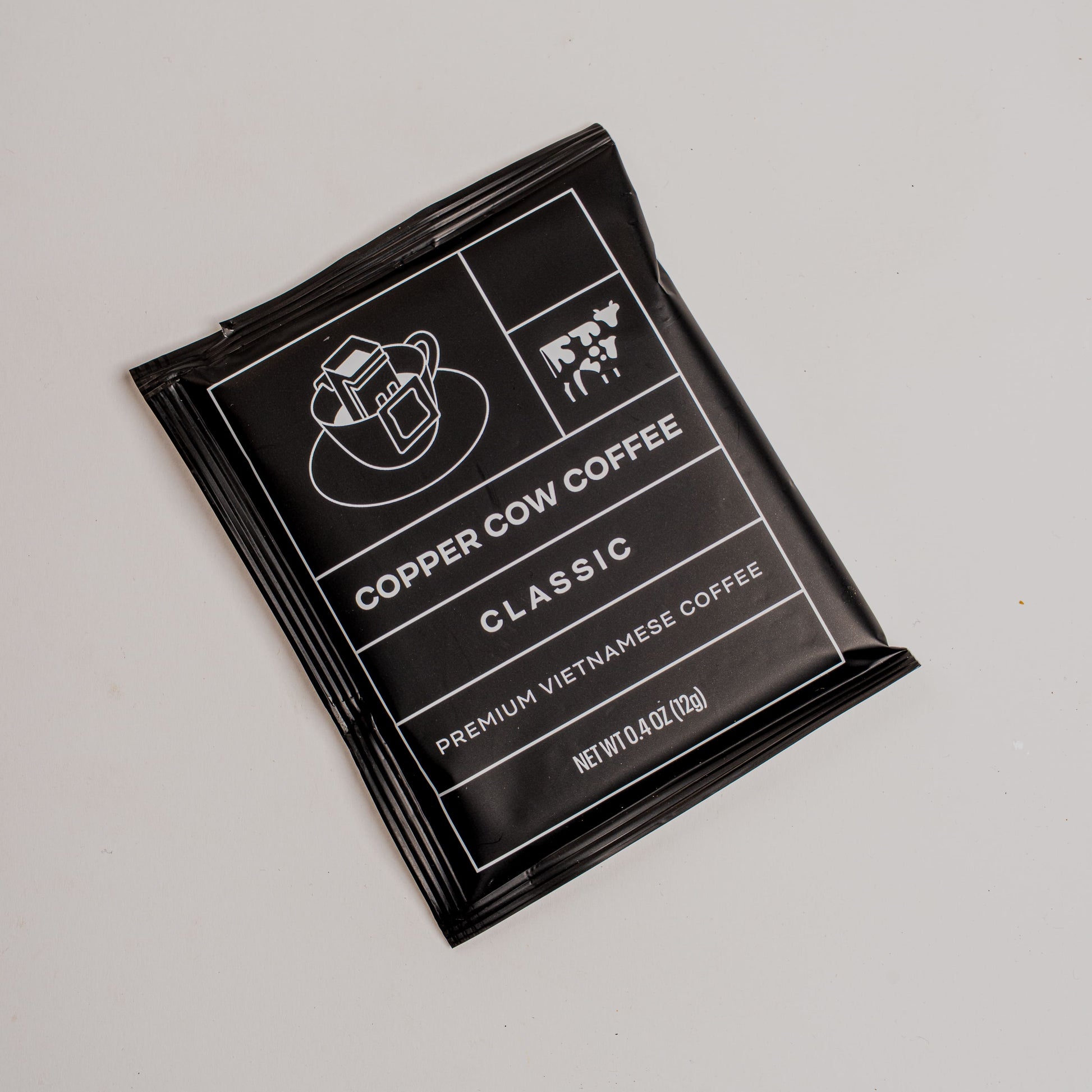 In 90 seconds, these single serve filters will brew a rich Vietnamese-style cup of coffee perfection with subtle chocolate + nutty notes. Comes with 1 pour-over pack (brews 1 cup of coffee). Coffee sourced from Vietnam.