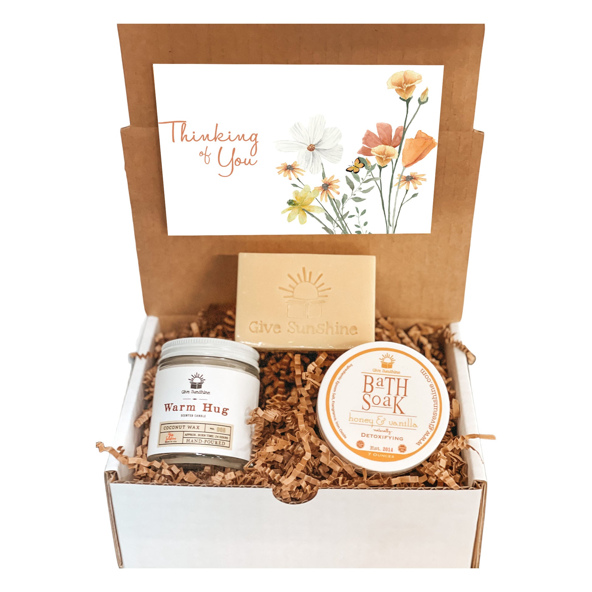 Our hand-poured candles fill your surroundings with a cozy ambiance, while the Goat Milk Citrus Soap pampers your senses and moisturizes your skin. Paired with the soothing Honey & Vanilla Bath Soak and a personalized notecard, it's a complete experience of love and sunshine.
