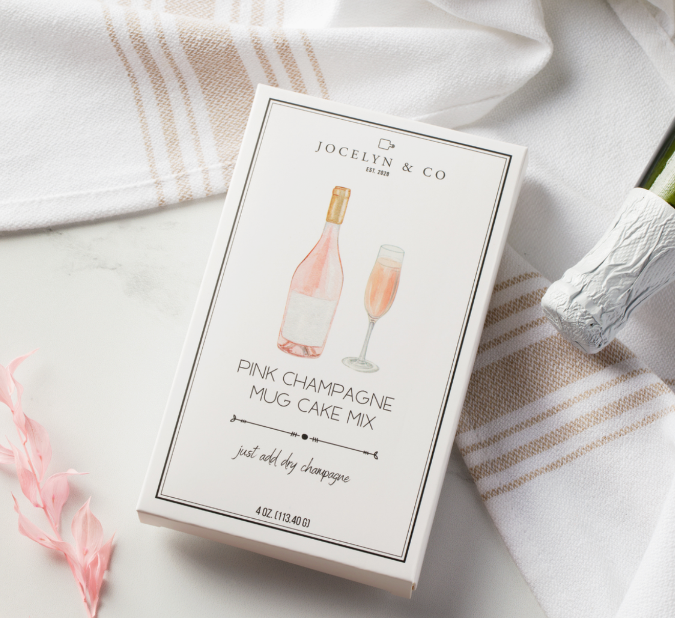 Pop the champagne! Our pink champagne mug cake is a single-serve and ready for mixing! We're changing our packaging! Our new box is 4x6.5x0.75 inches. Slim for flat lay gifts and the perfect size for retail shelves.